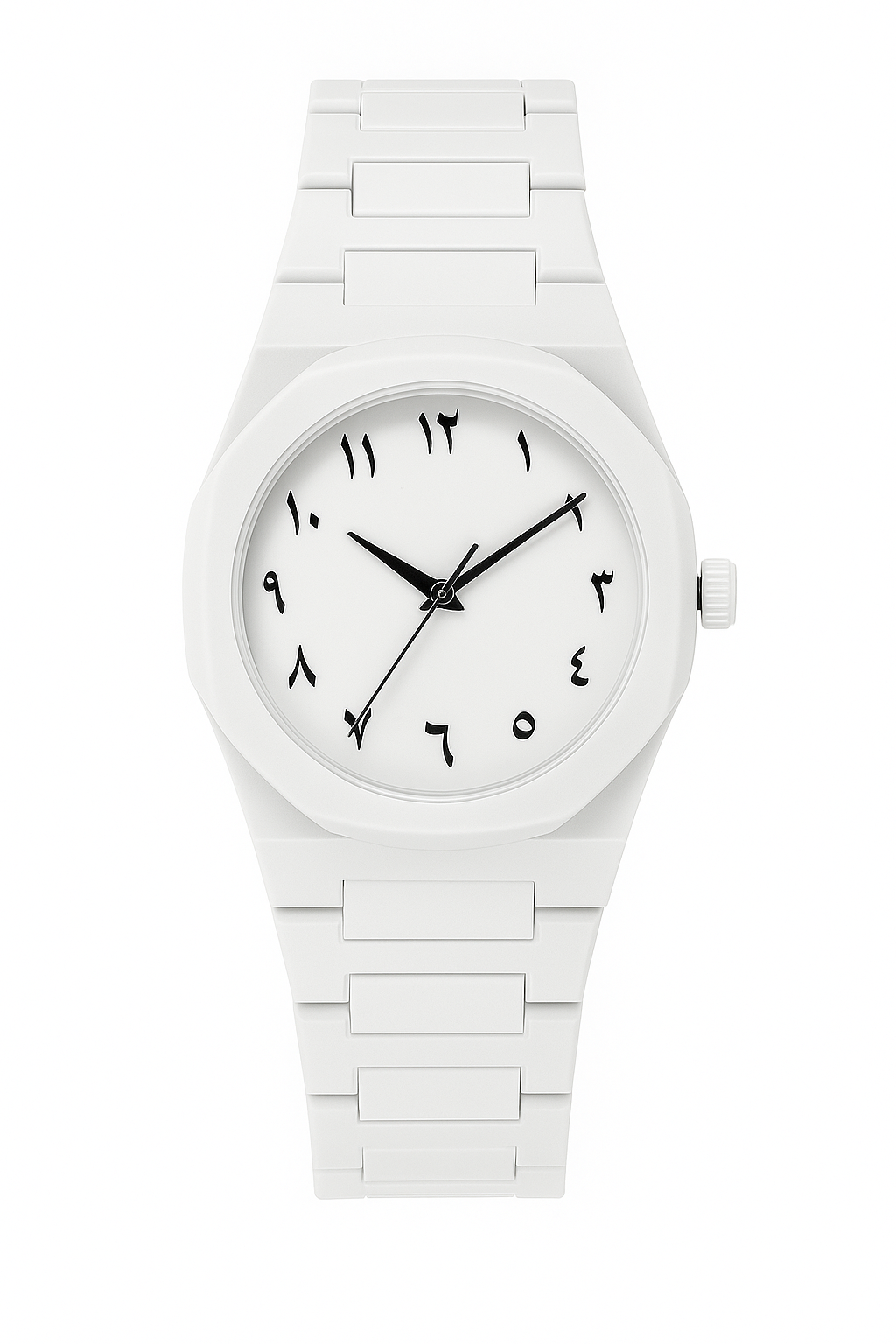 Bayda célèbre la beauté de la simplicité. Entièrement blanche, du boîtier au bracelet, elle dégage une élégance pure et minimaliste. Ses aiguilles noires offrent un contraste saisissant pour une lecture parfaite de l’heure. Alliance de modernité et de sobriété, Bayda s’adresse à ceux qui recherchent une montre raffinée, capable de s’adapter à toutes les occasions.